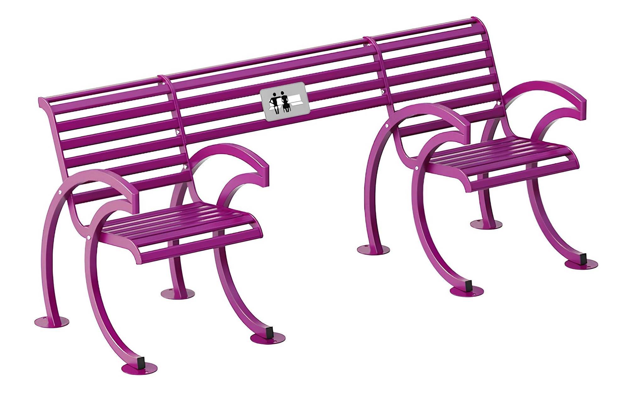 Cod. PN45I PANCHINA ONDA INCLUSIVA con alloggio centrale per disabili su carrozzina realizzata in acciaio zincato e verniciato, composta da n. 04 supporti con braccioli e piastre per il fissaggio a terra, spalliera e sedile realizzati da doghe in tubolare ovale sez. mm. 40x20. Colore a Vs. scelta.