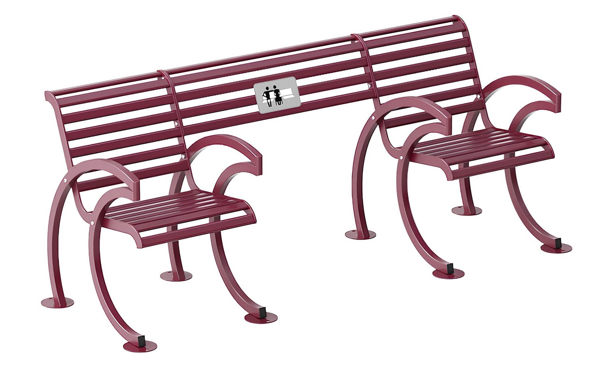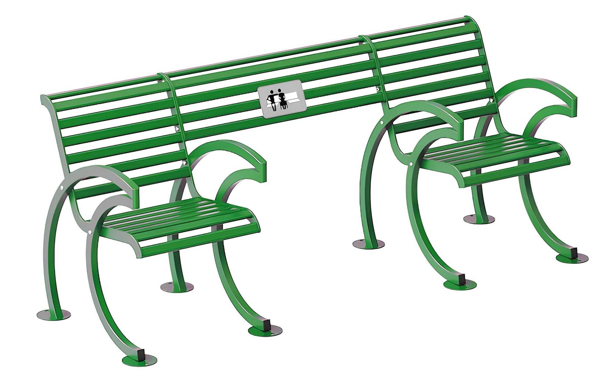 Cod. PN45I PANCHINA ONDA INCLUSIVA con alloggio centrale per disabili su carrozzina realizzata in acciaio zincato e verniciato, composta da n. 04 supporti con braccioli e piastre per il fissaggio a terra, spalliera e sedile realizzati da doghe in tubolare ovale sez. mm. 40x20. Colore a Vs. scelta.